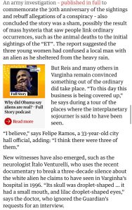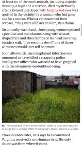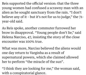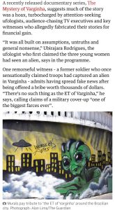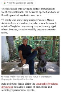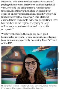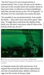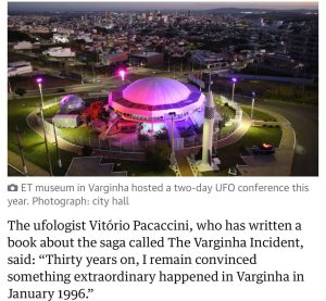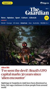 A reportagem do Jornal The Guardian relembra o Incidente de Varginha, ocorrido em 1996, quando moradores relataram ter visto uma suposta criatura extraterrestre. O episódio permanece como um dos casos mais conhecidos e talvez o mais importante da ufologia mundial.